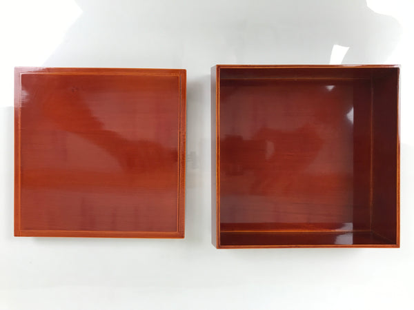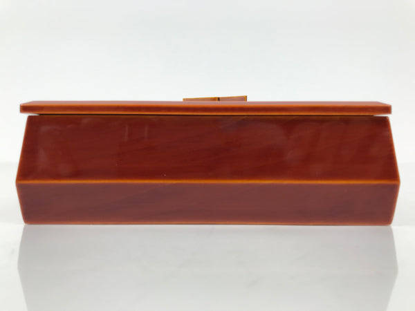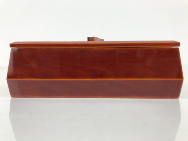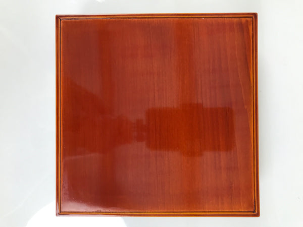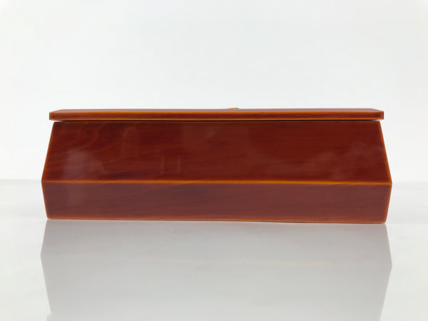 This is a vintage Japanese lacquered bento lunch box called jubako. It is caramel brown, true to the shunkei-nuri style of lacquerware. It features angled sides and the lid handle in the shape of a closed folding fan. While it can be used for small meals, it can also be used as a sweets container or kashiki for sencha and tea ceremonies. It comes with the original Washi paper box.