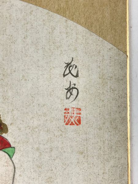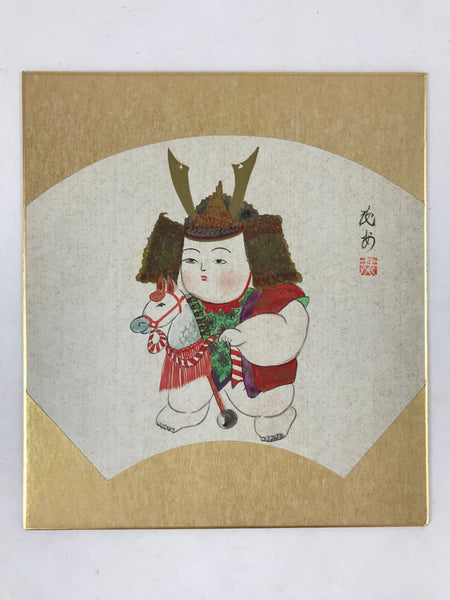 This item is a vintage shikishi art board. It features a hand-painted young boy wearing a kabuko helmet and playing with a horse toy. The illustration is colored with red and green and has several gold details. It is framed in a special shape surrounded by gold color paper. This shikishi art board is titled and signed with a red seal.