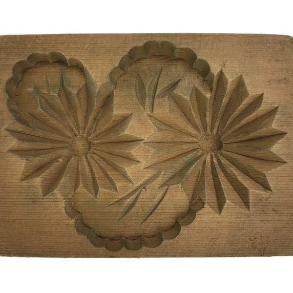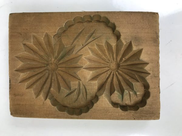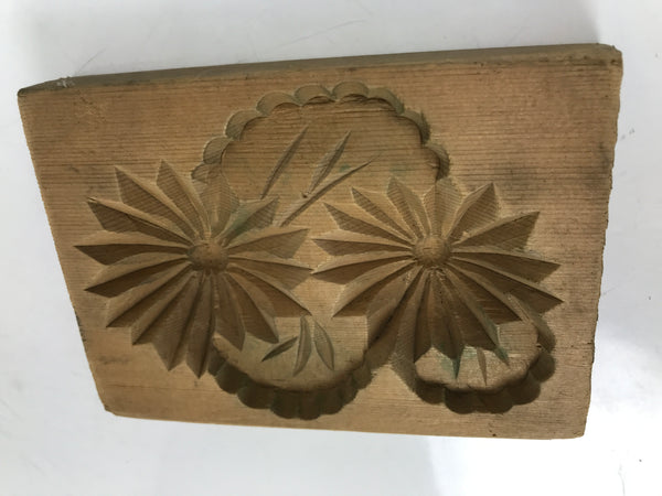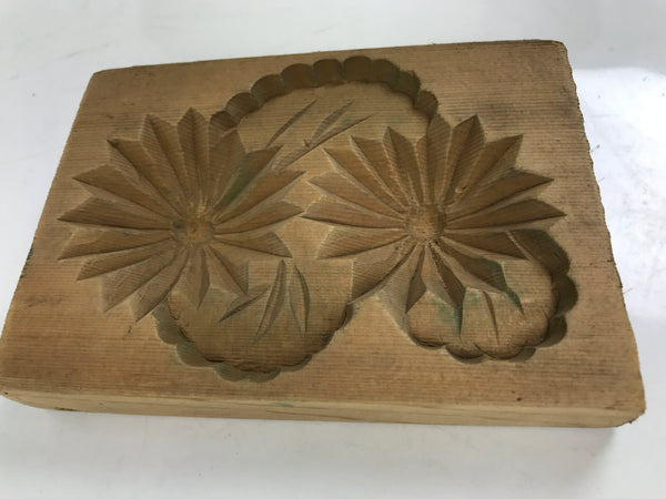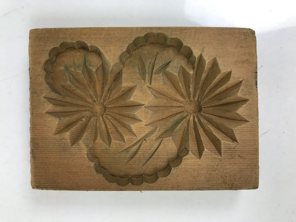 This single panel kashigata mold is carved with the design of a pair of chrysanthemums (kiku). This mold can be used to make sweets or as an eye-catching decorative item.