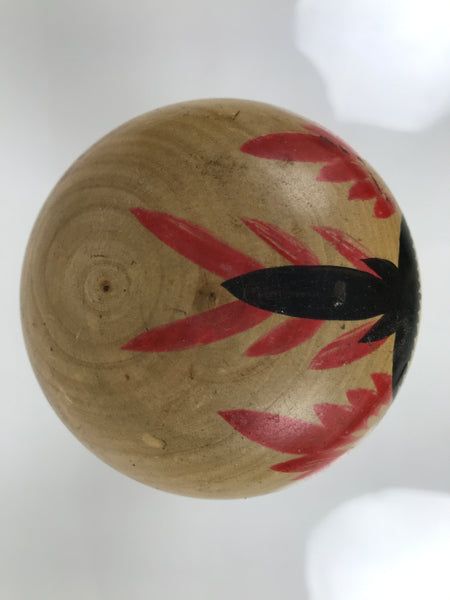 This vintage Japanese wooden kokeshi doll has a classic design (round head, cylindrical body). The body is slightly curved, and it is painted with red line bands and red floral designs. The facial expression is confident and youthful, and it is surrounded by tufts of black painted hair and extra red details to match the body. It has been brushed with a clear lacquer coating to give it shine.