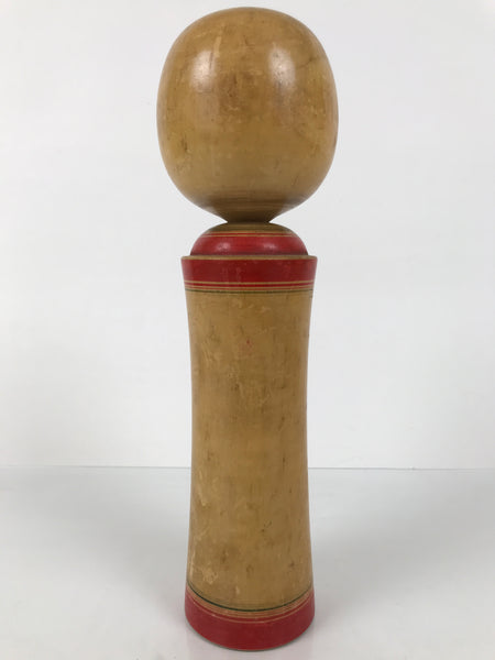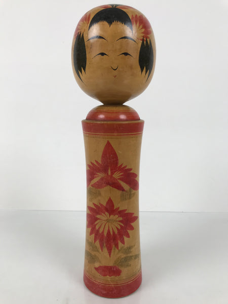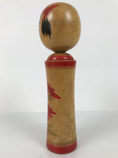 This vintage Japanese wooden kokeshi doll has a classic design (round head, cylindrical body). The body is slightly curved, and it is painted with red line bands and red floral designs. The facial expression is mature and neutral, and it is surrounded by tufts of black painted hair and extra red details to match the body. It has been brushed with a clear lacquer coating to give it shine.