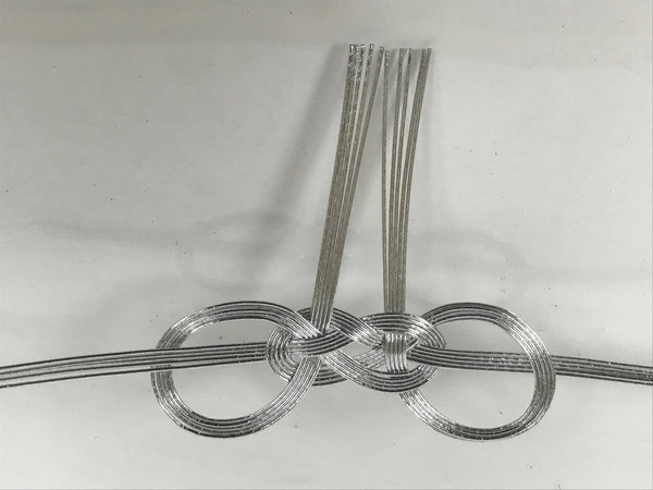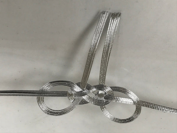 This item is a set of four ceremonial awaji-musubi knots in silver. These mizuhiki knots are commonly seen on gifts in numerous circumstances, such as funerals, weddings, and other congratulatory moments. Awaji-musubi style in particular is meant for one-time occasions. Silver (like these), black, and or white are universally used only for funerals with some regional differences. The tails of the knot are typically faced upward. They are made of stiff washi paper cord.