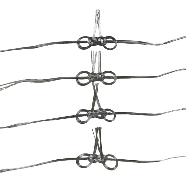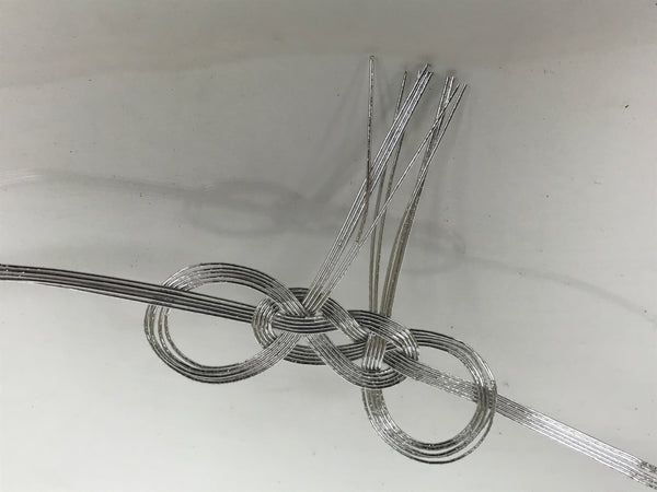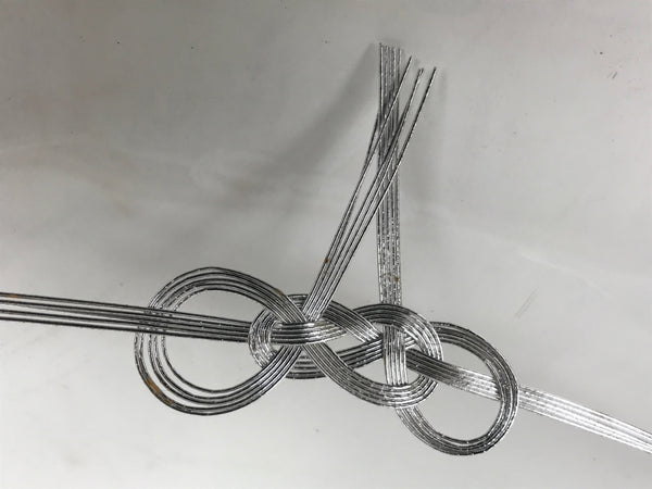 This item is a set of four ceremonial awaji-musubi knots in silver. These mizuhiki knots are commonly seen on gifts in numerous circumstances, such as funerals, weddings, and other congratulatory moments. Awaji-musubi style in particular is meant for one-time occasions. Silver (like these), black, and or white are universally used only for funerals with some regional differences. The tails of the knot are typically faced upward. They are made of stiff washi paper cord.