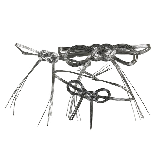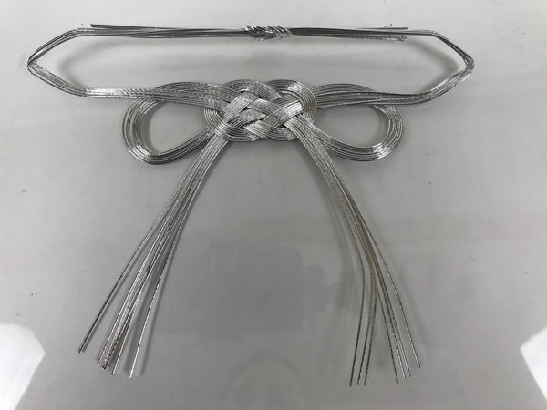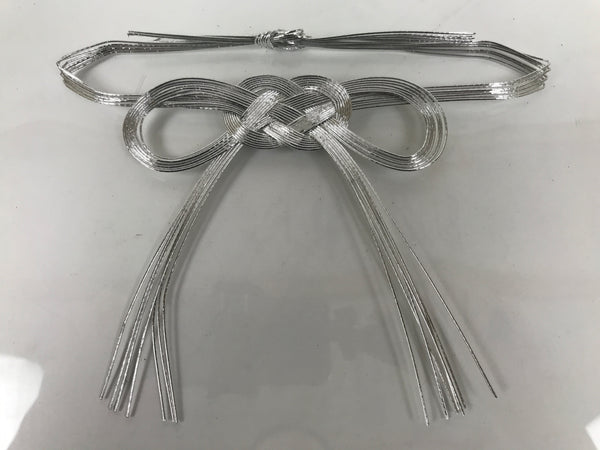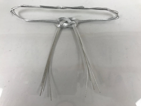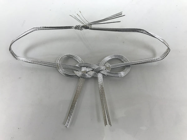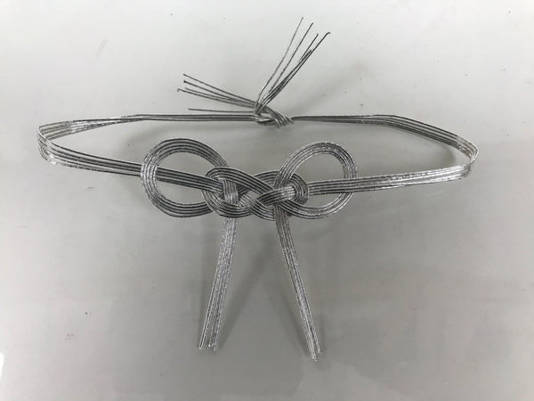 This item is a set of three ceremonial awaji-musubi knots in silver. These mizuhiki knots are commonly seen on gifts in numerous circumstances, such as funerals, weddings, and other congratulatory moments. Awaji-musubi style in particular is meant for one-time occasions. Silver (like these), black, and or white are universally used only for funerals with some regional differences. The tails of the knot are typically faced upward. They are made of stiff washi paper cord.