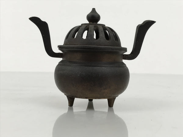 This is a vintage Japanese Buddhist brass incense burner (koro) commonly used in Buddhist altars. It is a small pot made of aged, browned brass with decorative vertical-facing side pieces and a loose-fitting caged lid. It is used for burning incense powder, chips, or sticks. Burning incense is a means of purifying the body of the worshiper.