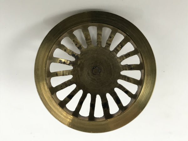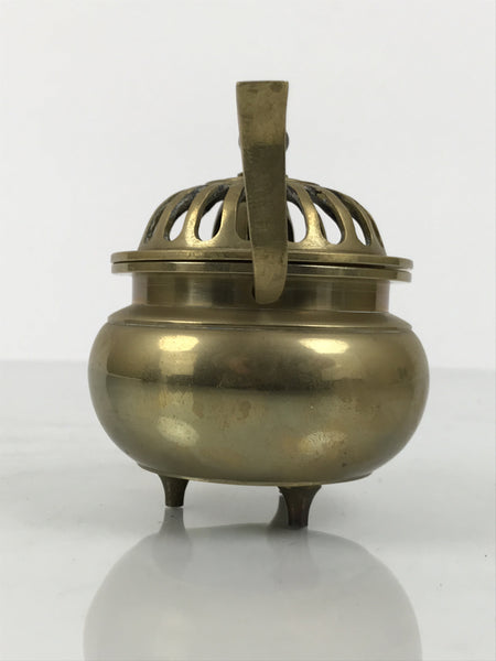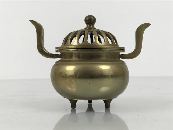 This is a vintage Japanese Buddhist brass incense burner (koro) commonly used in Buddhist altars. It is a small pot made of aged brass with decorative vertical-facing side pieces and a loose-fitting caged lid. It is used for burning incense powder, chips, or sticks. Burning incense is a means of purifying the body of the worshiper.