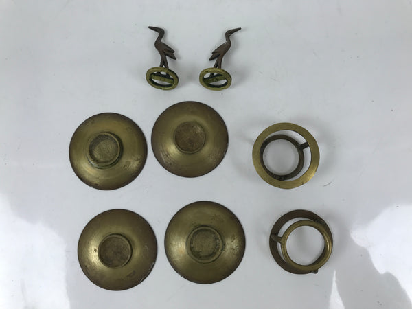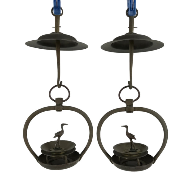 This is a vintage Japanese Buddhist brass hanging lantern, or rinto, made to be hung in Buddhist altars (butsugu). This brass lantern is brown in color and has minimal design detail. This set features small weights in the shape of cranes (tsuru). Rinto is a brass lantern used to light up the inside of a Buddhist altar with candles, and sometimes can be made electric. It is also a beautiful decorative item on its own.