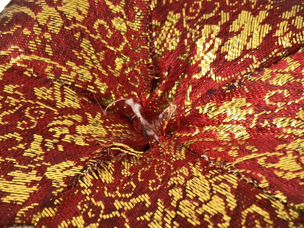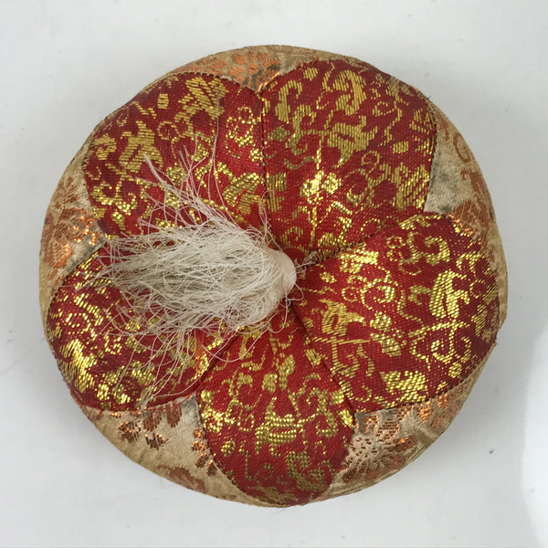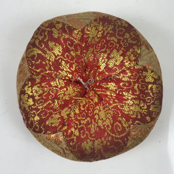 This is a vintage Japanese orin bell pillow or cushion for Buddhist altars. It is made of a combination of red with gold and beige with gold silk fabrics featuring chrysanthemums and other floral motifs. It is in a classic round shape with a simple beige tassel on one side.