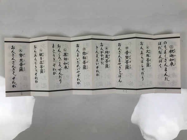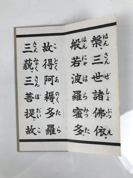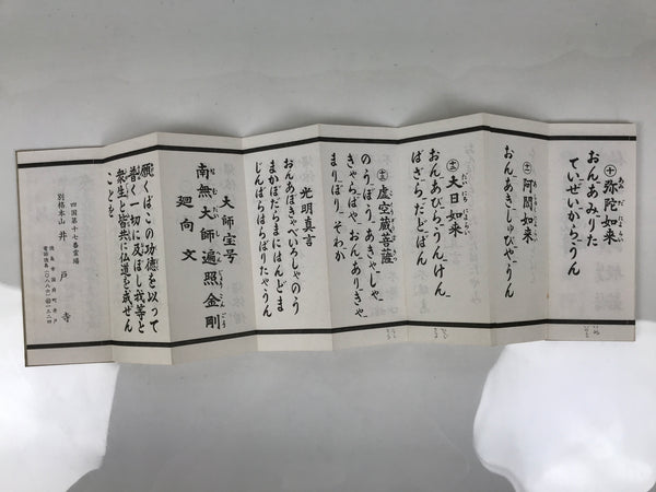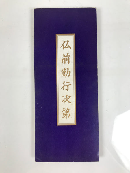 This vintage Japanese Buddhist accordion-style book is called Butsuzen Gongyo Shidai and contains several Buddhist texts such as the Heart Sutra (Hannya Shingyo). This book is from Idoji Temple., the 17th temple of the Shikoku Sacred Places pilgrimage. This book has a purple-blue cover. The pages are printed on both sides.