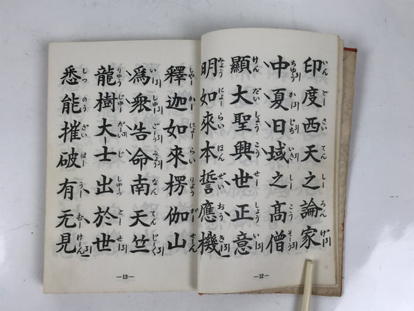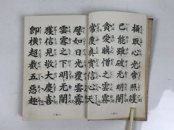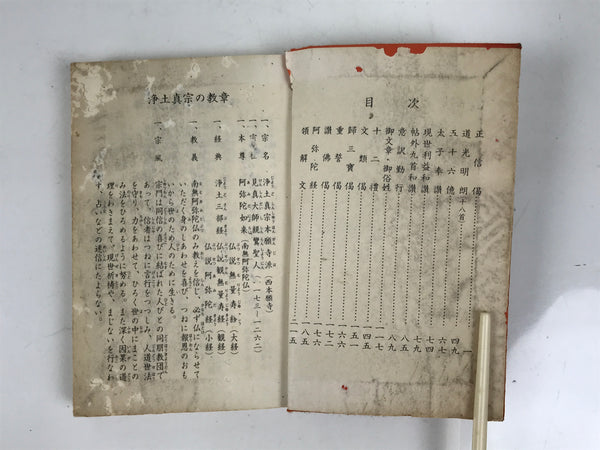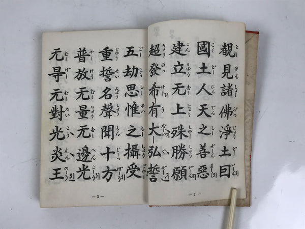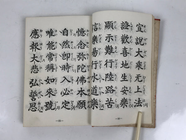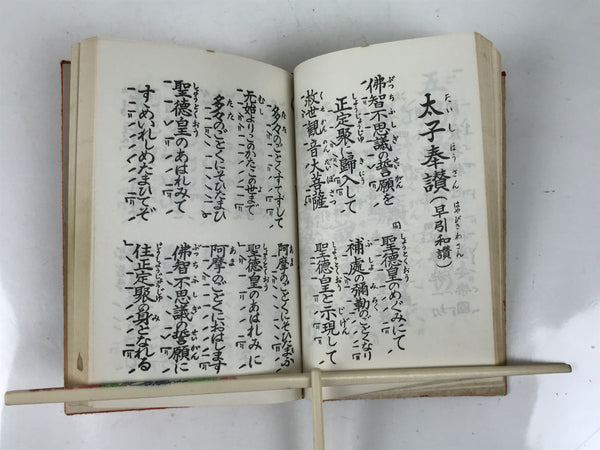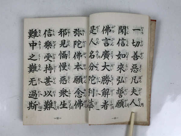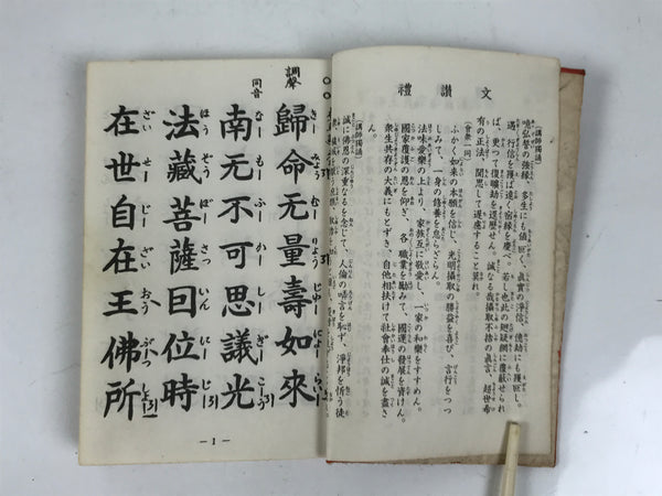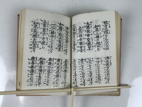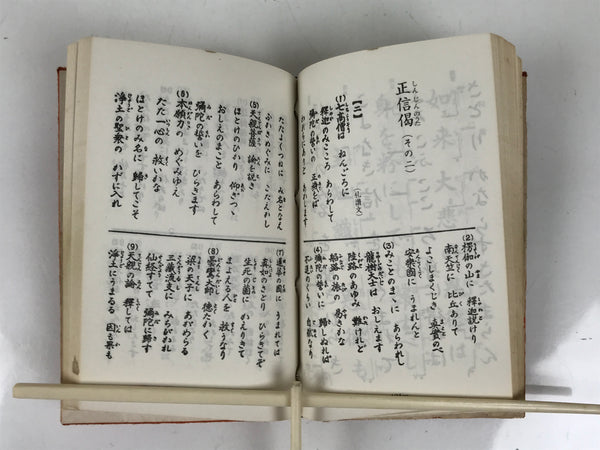 This vintage Japanese Buddhist book is titled Zaike Gongyoushu. It features texts and sutras for the Jodo Shinshu school. This book has a red cover.