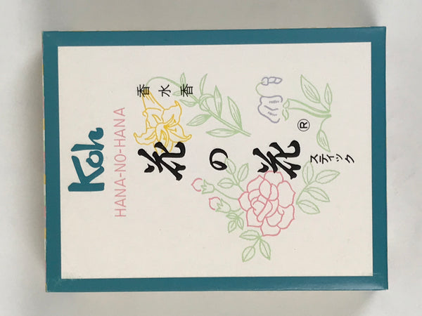 This is a set of three types of vintage Japanese incense sticks named Hana-no-hana, meaning flower of flowers. The incenses are cased in a resin case with a metal incense stand, and that is in a paper box. Each incense smells of lily (green), rose (yellow), and violet (purple); all floral scents. It contains thirty-six sticks; twelve sticks for each scent.