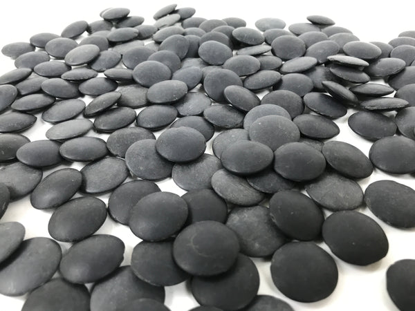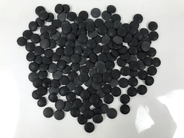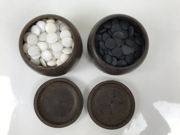 This is a vintage goishi, or go stone, set used to play the popular strategy board game Igo, or Go. This beautiful set of game pieces made from black stone and white glass is contained in lidded dark brown wooden bowls for easy, decorative storage.