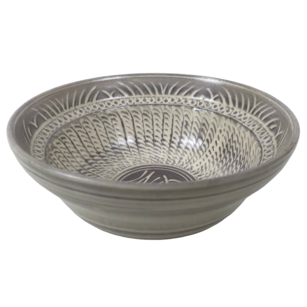 This vintage Japanese Mishima yaki ceramic pottery small bowl, also called kobachi, is gray with a busy white line and loop design on the inside, and a banded design on the outside. It has a ridge on the inside for added dimension and is perfect for side dishes and desserts.
