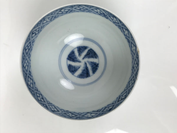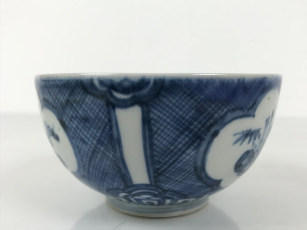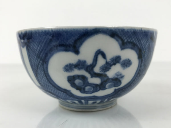 This is a Japanese vintage porcelain rice bowl. The bowl is decorated with sometsuke-style dark blue shochikubai design (plum blossom, pine tree, bamboo). Shochikubai is a popular, traditional winter motif that symbolizes perseverance and renewal. The inner rim has a diamond floral pattern, and there is a spiral at the bottom of the bowl. It is the ideal size to serve soup, rice, or other small foods.