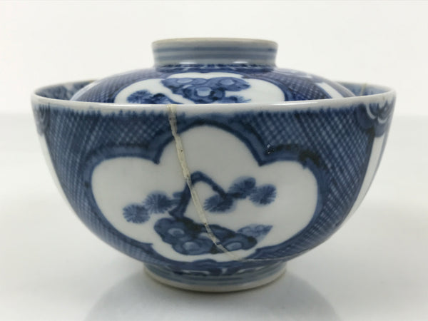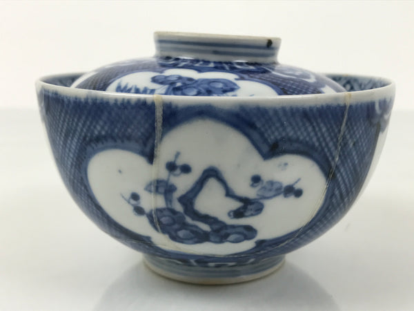 Japanese Porcelain Sometsuke Lidded Rice Bowl Vtg Owan White Blue Plum Pine Y479