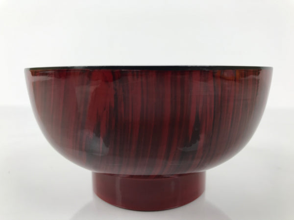 This is a vintage Japanese soup bowl, owan, typically used for serving rice, miso soup, or other kinds of soup.  This lacquerware replica bowl is red and has a design on the outside, resembling a brushed mark with black ink. This easy-to-use bowl is a good addition to a traditional Japanese dinnerware set.