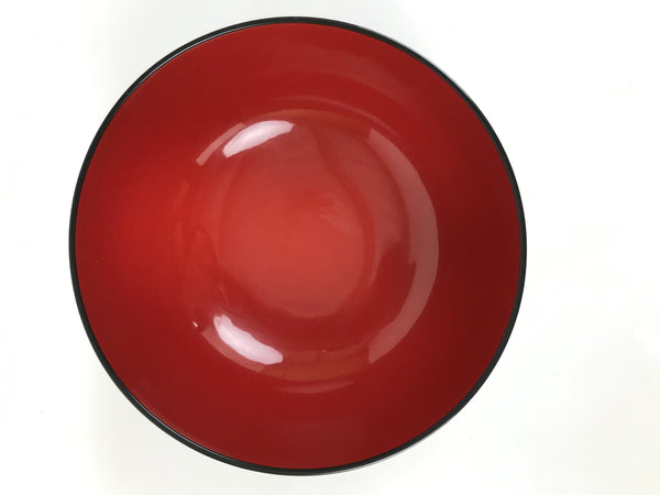 This is a vintage Japanese soup bowl, owan, typically used for serving rice, miso soup, or other kinds of soup. This lacquerware replica bowl is red and has a design on the outside, resembling a brushed mark with black ink. This easy-to-use bowl is a good addition to a traditional Japanese dinnerware set.