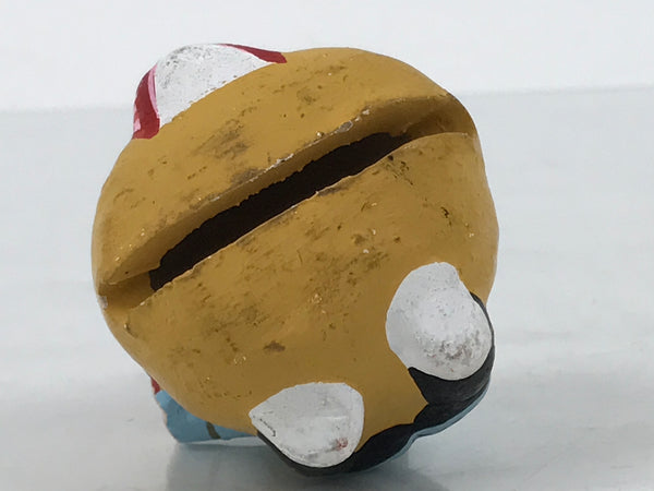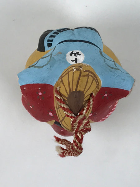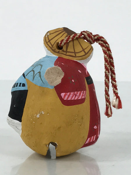 This is a vintage Japanese clay bell, Dorei or Tsuchi-Suzu. This dorei has a classic bell shape, but on either side is the male and female attire worn during the Awa Odori, a famous summer festival dance in Tokushima Prefecture on the island of Shikoku. Perhaps the most iconic piece is the narrow straw hat worn by female dancers specifically along with a bold-colored yukata. The male dress is a happi (small jacket) with tabi. There is a small white clay ball inside as well as a red and white string tied at the top.