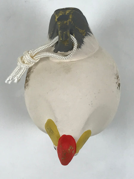 This is a vintage Japanese clay bell, or dorei. Representing the animals of the zodiac, this bell is in the shape of a chicken or rooster. It is mostly white with a yellow and red head, gray tail feathers, and subtle gold accents. It has a small white clay ball inside and has a simple white string tied on the tail.