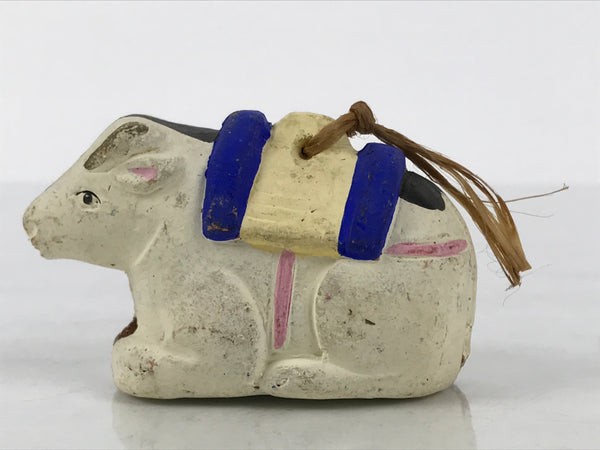 This is a vintage Japanese clay bell, or dorei. Representing the animals of the zodiac, this bell is in the shape of a sitting cow. It is mostly white with a blue and beige pack or blanket on its back. It has a small brown clay ball inside and has a twine string tied at the top via a loop.