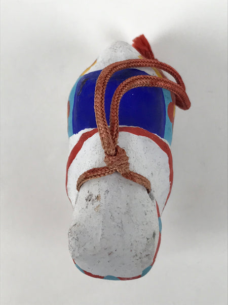 This is a vintage Japanese clay bell, or dorei. Representing the animals of the zodiac, this bell is in the shape of a horse. It is mostly white with handpainted reins and saddle in red, blue, and yellow. It has a small brown clay ball inside and has a faded red cord tied at the top via a loop.