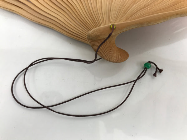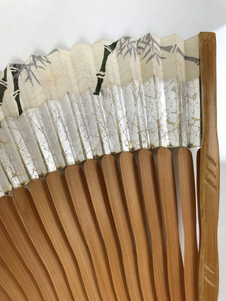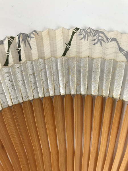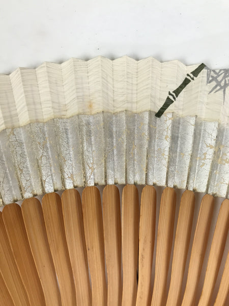 This is a traditional Japanese folding fan called sensu. You can use this when it's hot or as decoration. This fan is made with a natural bamboo frame with a unique wavy shape. The front side has a bamboo stalk and leaves design on a white background with a silver foil band of color beneath it. The back side is plain beige/brown. It has a brown string attached to the bottom with a green glass bead.