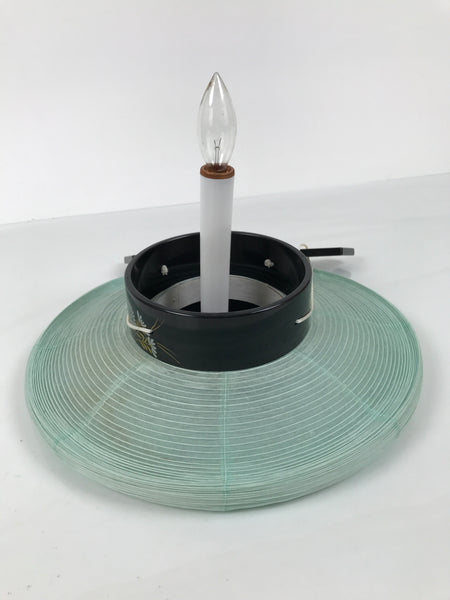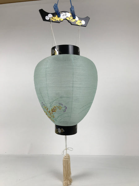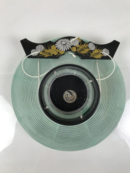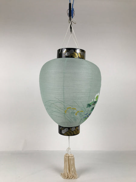 This is a vintage Japanese paper hanging lantern called chochin. This round lantern, likely a lantern for the Obon summer festival, is made with thin green washi paper, a thin paper frame, resin black, silver and gold top and bottom, and a string handle. The body of the lantern is decorated with a floral pattern of chrysanthemums and other flowers such as pampas, na no hana, and hibiscus. This lantern comes with a battery-operated light bulb (not tested) to be placed inside, and a matching box.