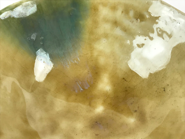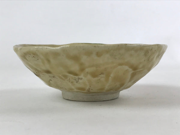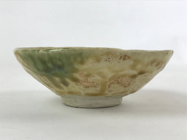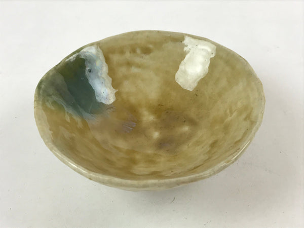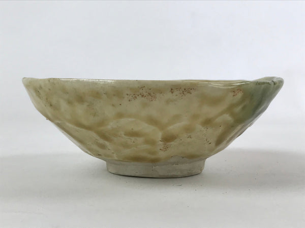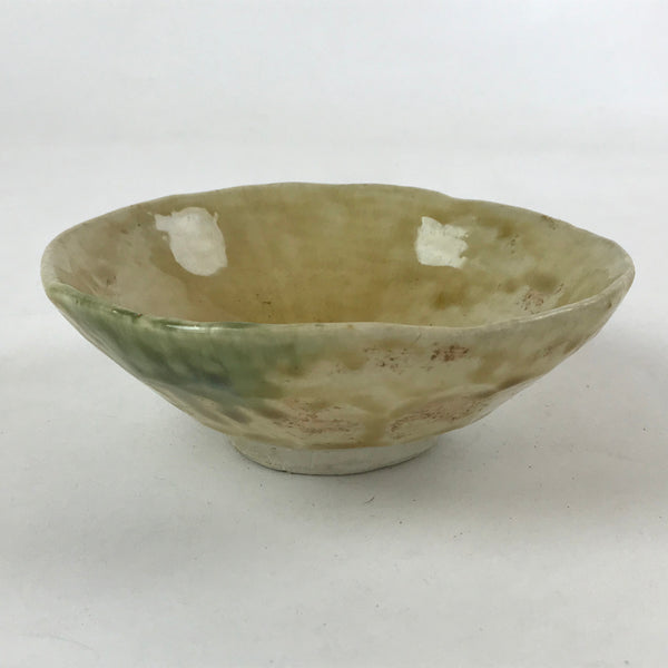 This is a vintage Japanese ceramic green tea bowl, Matcha Chawan. It has a yellow glossy crackle glaze with a dash of green. This bowl is signed on the bottom. It has a V shape and has an irregular circle edge. This type of bowls is traditionally used for preparing and drinking green tea during tea ceremonies.