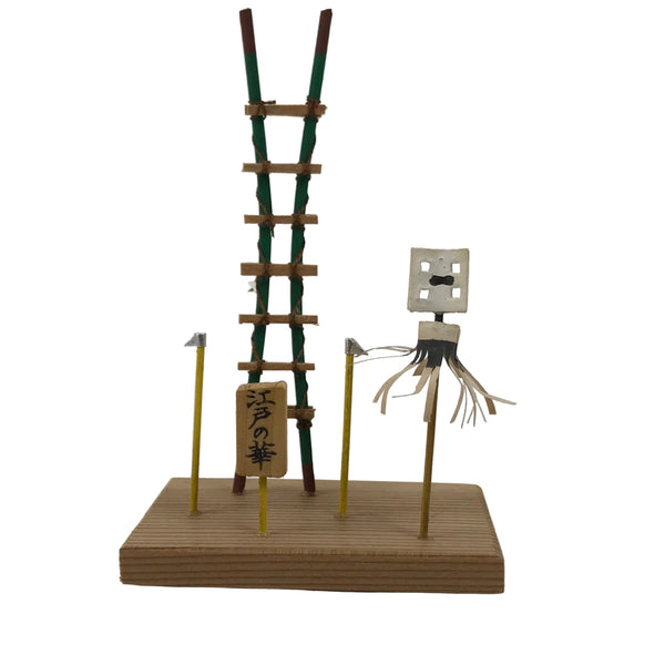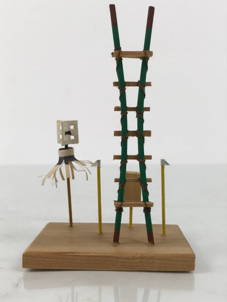 This is a vintage Japanese wooden miniature display. It depicts a ladder, a flag (Matoi), and a pair of fire hooks (Tobiguchi), which are all firemen's tools in the Edo era.  It has a wooden sign. It is cased in an original paper box.