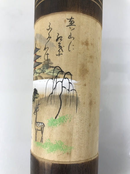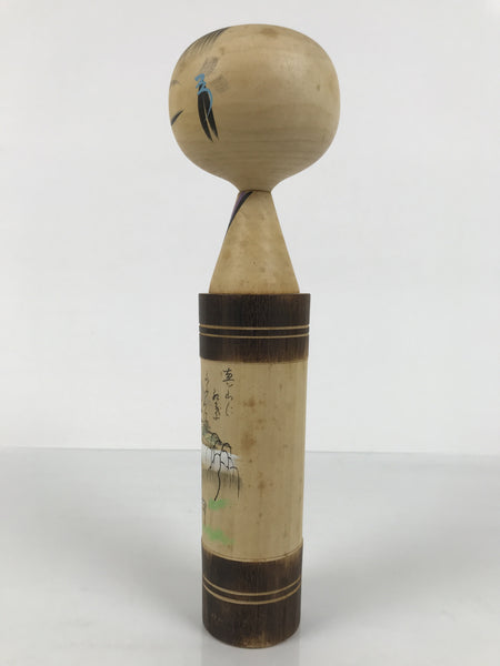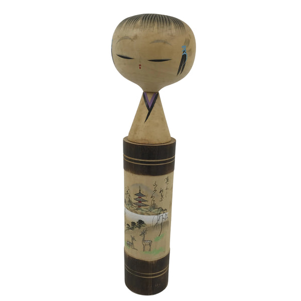 This vintage Japanese wooden kokeshi doll has a classic design (round head, cylindrical body). The body is straight with brown bands on the top and bottom. The shoulder is tapered with a thin neck and a wobbly head. It is painted with a Japanese poem, Waka, and its scenery with a pagoda, deer, trees, and a distant mountain. The facial expression is calm , eyes closed, and the tufts of hair with blue and white ribbons are painted. It has been brushed with a clear lacquer coating to give it shine.