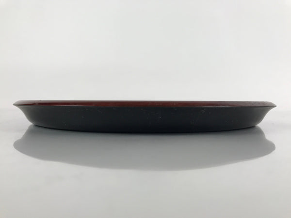 A rich chocolatey brown, this vintage lacquer replica Japanese serving tray made of resin plastic is small and round with slightly raised sides so drinks cannot easily slide off. The back side is plain black with gold kanji writing that says the tray was a congratulatory gift and includes the names of the couple.