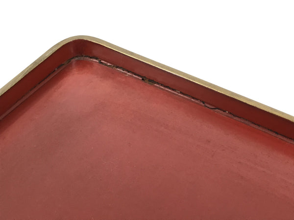 This is a vintage Japanese lacquered wooden table or ozen. This low square table is lacquered a rich red color with a golden border. This table is used on the floor for traditional meals at tea houses, kaiseki restaurants, and ryokan inns. One table is used by only one individual and sometimes it is paired with another smaller ozen.