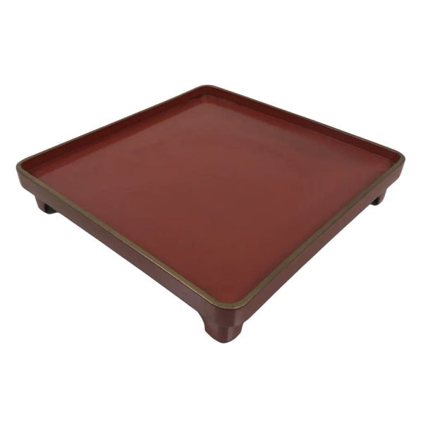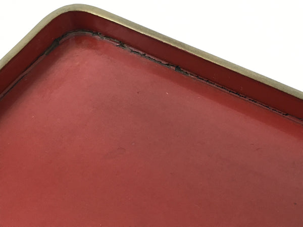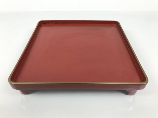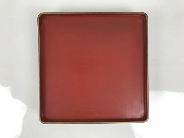 This is a vintage Japanese lacquered wooden table or ozen. This low square table is lacquered a rich red color with a golden border. This table is used on the floor for traditional meals at tea houses, kaiseki restaurants, and ryokan inns. One table is used by only one individual and sometimes it is paired with another smaller ozen.