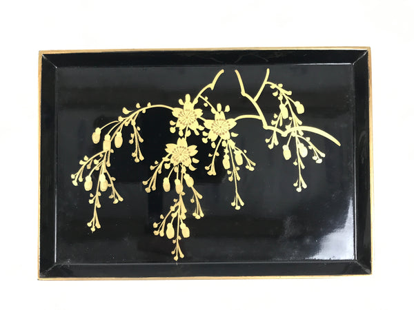 This is a vintage Japanese wooden lacquered decorative tray, or Obon. It is small and the perfect size for jewelry, key, small trinkets, and also can be used as a money tray. Lacquered a glossy black, this tray has a gold rim as well as gold makie cherry blossoms, more specifically shidarezakura, a type of willowy, hanging cherry blossom tree.