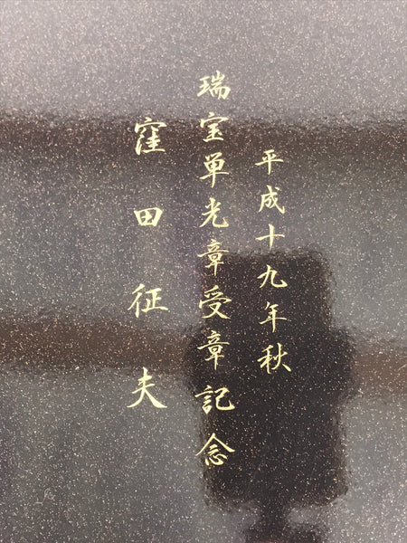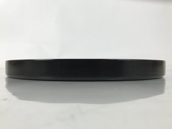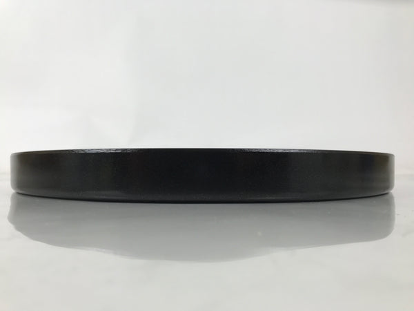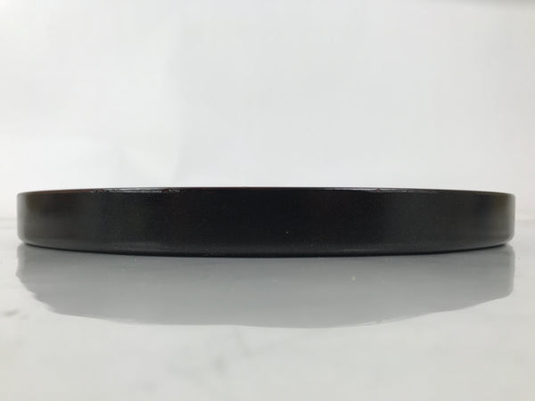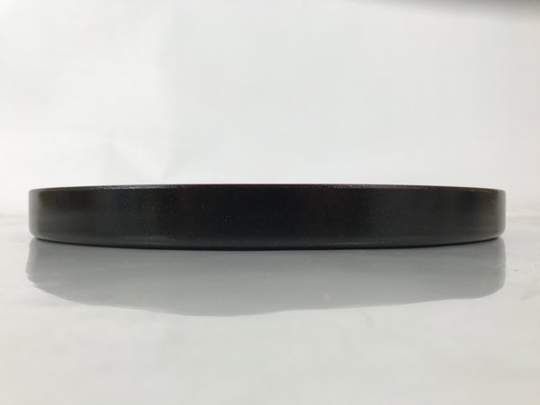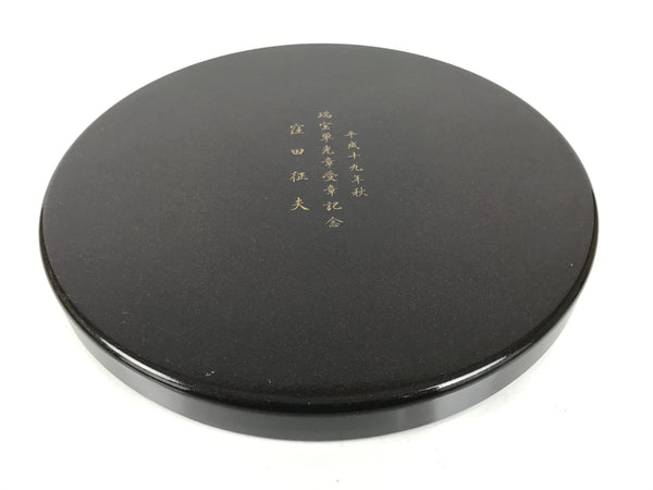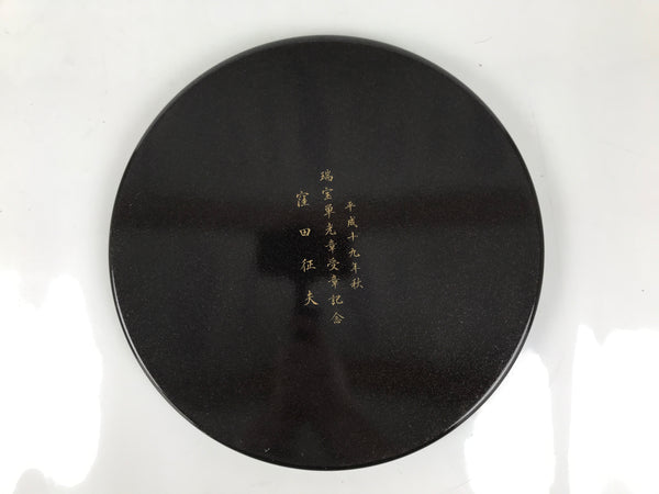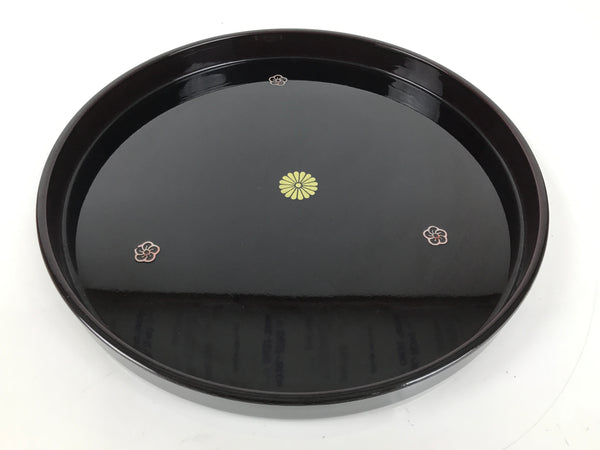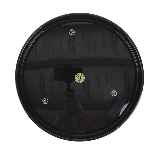 This is a vintage lacquered serving tray, or obon. It is round and dark brown with a raised edge. The tray features a gold Makie of chrysanthemum and small flowers in Raden or shell inlay. The outside of the tray is coated with sparkling lacquer. There is some writing on the back. It comes with the original paper box.