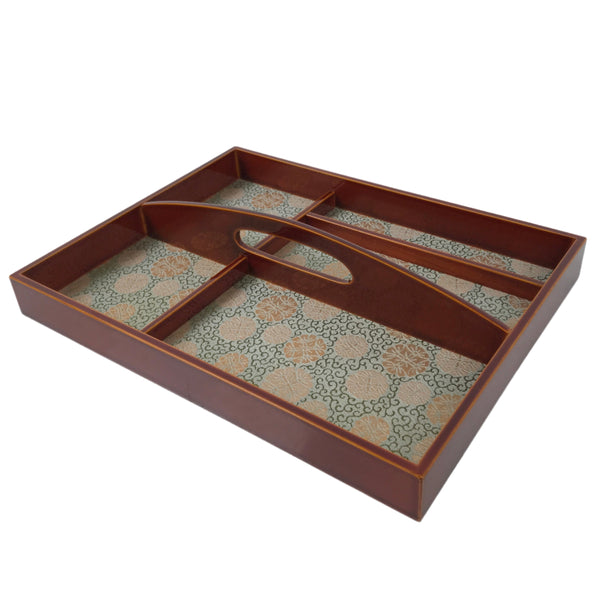 This is a Japanese lacquered wooden stationery organizer tray. It has a handle for easy transport and has 5 neatly sectioned compartments. This classic caramel-brown shunkei-nuri lacquer piece is a beautiful decorative and functional addition to any home or office space. It features a floral-patterned silk fabric lining in silver, gold, and green. The original box is included.