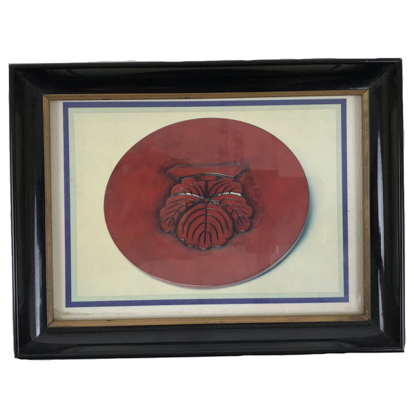 This is a vintage Japanese photograph of a Kamakura-bori plate. It features a family crest, Kamon, of Ivy or Tsuta. The oval-shaped Kamon photograph is on three layers of rectangular papers, each in a different color: off-white, light green, and purple. This piece is framed in a wood frame with a glass panel. It has a resin foot for standing. It is an elegant piece for home and office decor.