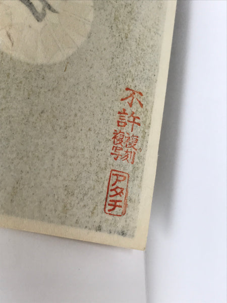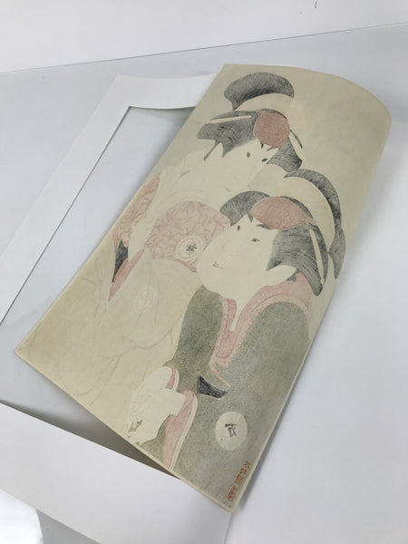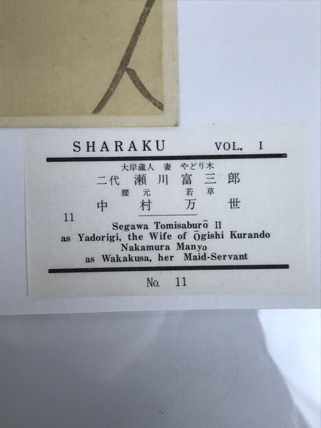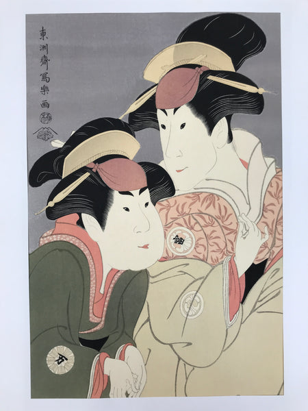 This Japanese ukiyo-e is a woodblock print by Toshusai Sharaku featuring two kabuki actors in character. The characters are women. They are wearing kimono with pattern under a plain color kimono. This piece is titled 'Segawa Tomizaburo as Yadorigi, the Wife of Ogishi Kurando; Nakamura Manyo as Wakakusa, her Maid-Servant'. Actors who play female roles in kabuki are called onnagata. The print is placed on a thick paper that folds in two with an opening on the top. There is a label with explanations in English on the inside. This piece is an authentic woodblock print, but it is a reprint, not a first edition.