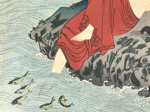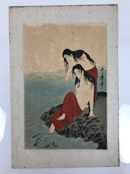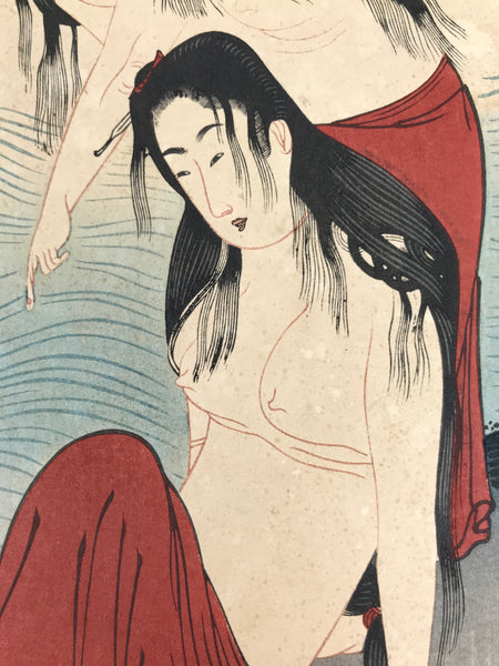This Japanese ukiyo-e is a woodblock print by Kitagawa Utamaro. It is the left piece of a three-part work called 'Abalone shell divers' or 'Pearl divers'. This piece represents two women on a rock next to the sea trying to get abalone shells, or awabi in Japanese. The two women are pictured topless with a red piece of fabric attached to their waist, and they have their hair down. One of the women has her fit in the water and the other one is pointing at something. Five fish are also painted. This piece is an authentic woodblock print, but it is a reprint from the Showa period, not a first edition. The print is placed on a piece of cardboard.