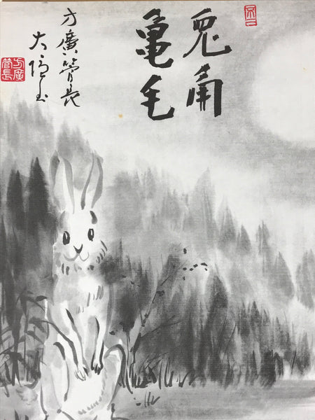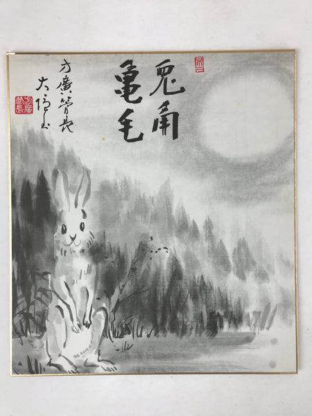 This is a vintage Japanese zodiac shikishi art board. It is hand-painted and features rabbit painted in a cute realistic style. The rabbit is standing under the moonlight. There is a wood on the background. This shikishi is painted in a black-and-white monochrome style. It also has some inscriptions. This shikishi art board is signed.