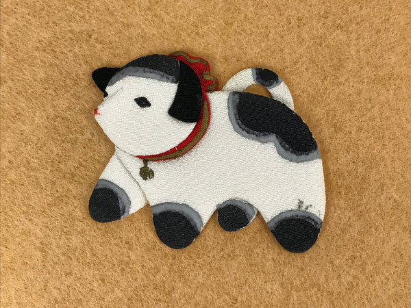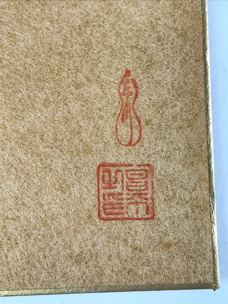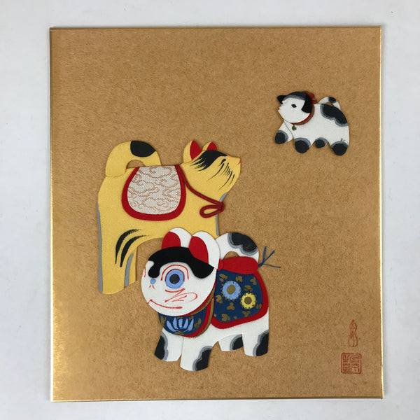 This item is a vintage Japanese shikishi art board. In the style of oshie zaiku, or padded silk, this piece features raised zodiac image of a tiger and other feline traditional figurines in various colors. This particular piece was handcrafted at the Higashigawa Handicraft Workshop in Omi Hachiman, Shiga Prefecture and comes with its original cardboard cover. It is signed with red seals.
