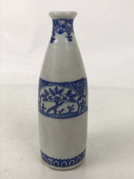 This is a Japanese antique porcelain sake bottle, or Tokkuri. It features a shochikubai design (pine, plum, bamboo) with decorative borders. Its compact size makes it easy to use daily for beverages or as a small flower vase.