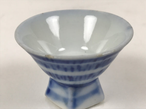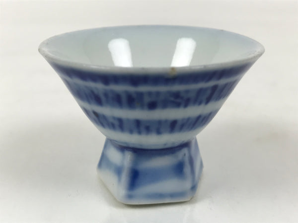 This is a vintage Japanese porcelain sake cup. This particular type of cup is called wan or "bowl type" due to its resemblance to a rice or tea bowl. In terms of size, it is also called ochoko. This hexagonal-footed cup is white with a sometsuke blue jagged stripe pattern in bands around the outside.