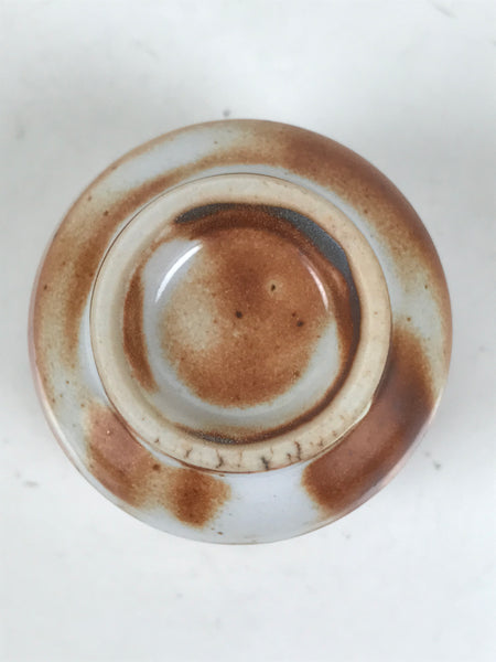 This is a vintage Japanese ceramic sake cup. This particular type of cup is called tsubomi or "bud type" due to its resemblance to a flower bud. In terms of size, it is also called ochoko. It has a brown and white, almost marbled, pattern, similar to Red Shino ware pottery.