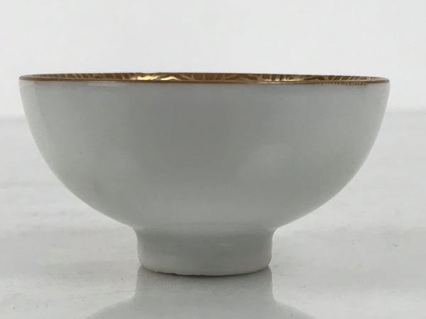 This is a vintage Japanese Kutani porcelain sake cup. This particular type of cup is called tsubomi or "bud type" due to its resemblance to a flower bud. In terms of size, it is also called ochoko. This beautiful imari sake cup is fully decorated with precise gold linework on a brown inner rim. The entire design features a decorated court carriage ox cart, also called gosho guruma. It has the Kutani marking on the bottom.