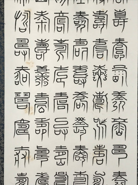 This vintage Japanese boxed hanging scroll (kakejiku or makimono) features calligraphy of a hundred characters for the kanji 寿 jyu longevity, written in different styles. This piece is signed with a name and a red seal. The lid has inscriptions on the outside.