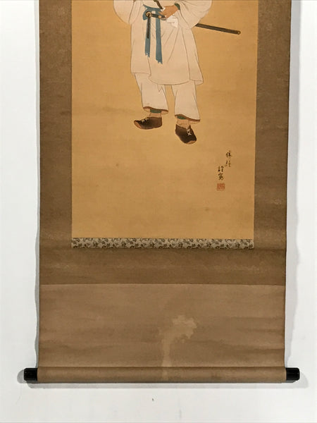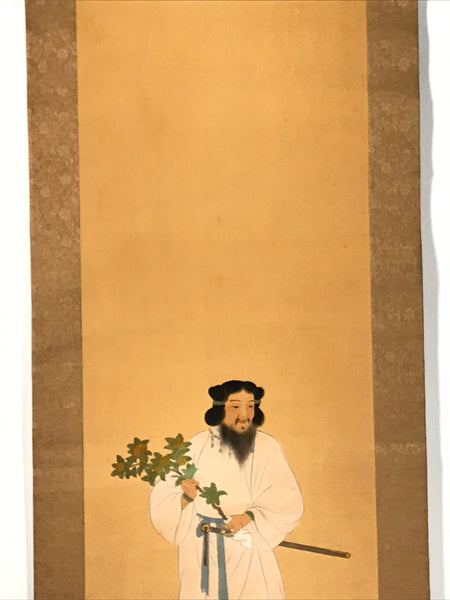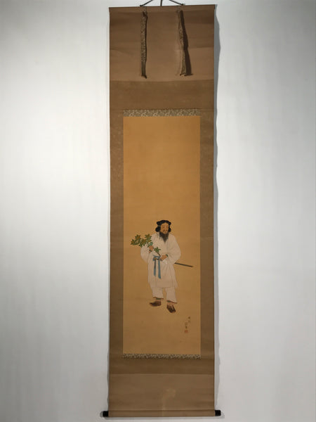 This vintage Japanese boxed hanging scroll (kakejiku or makimono) features the portrait of a man, Tajimamori, known as the God of Sweets or the God of Citrus. Tajimamori is standing and holding a branch with fruits, likely tachibana oranges. He is dressed in Kofun period style clothing. The scroll is signed with a name and a red seal. The lid of the matching wooden box has inscriptions on the outside and the inside.