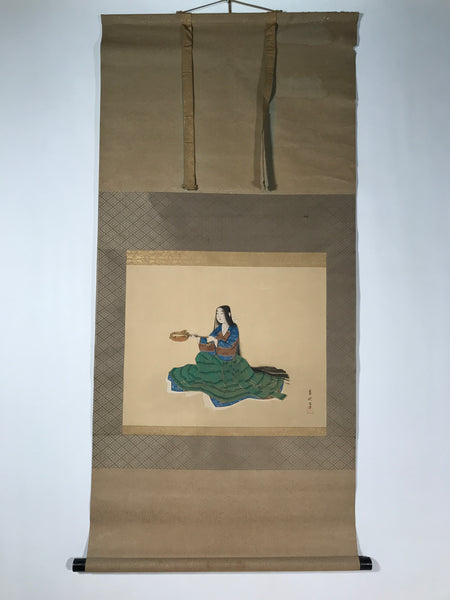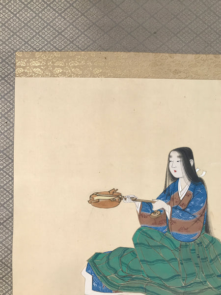 This vintage Japanese hanging scroll (kakejiku or makimono) represents a noble lady with long black hair dressed in a green kimoni sitting and holding a tool with a long handle used to pour liquids. This piece is signed with a name and a red seal.