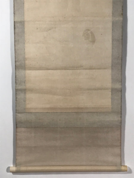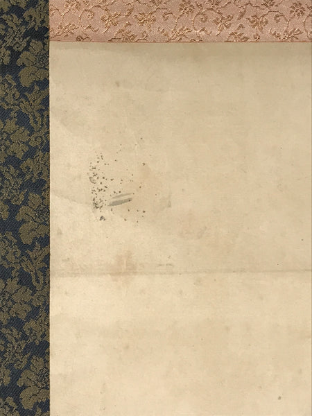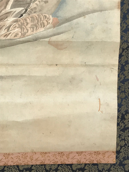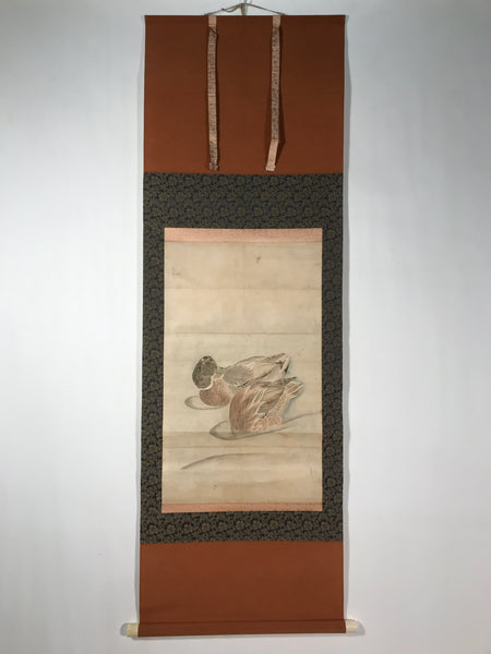 This vintage Japanese hanging scroll (kakejiku or makimono) features a couple of ducks swimming on a river. One duck is ducking its head in the water. The base is brown and features a dark floral pattern. This piece is signed with a name and a red seal.