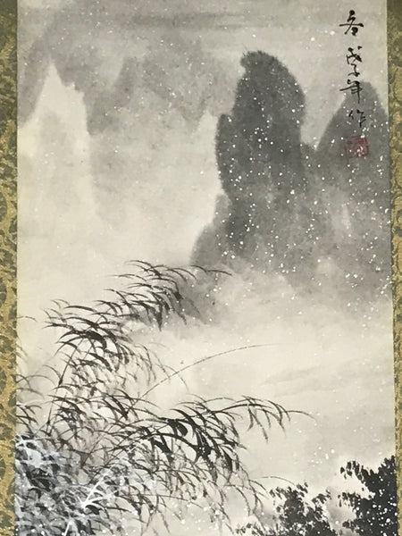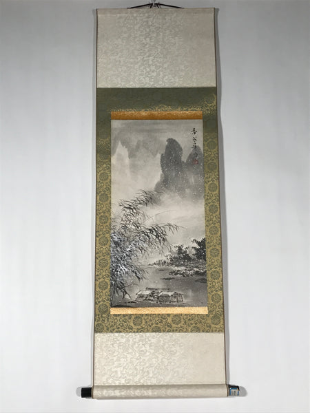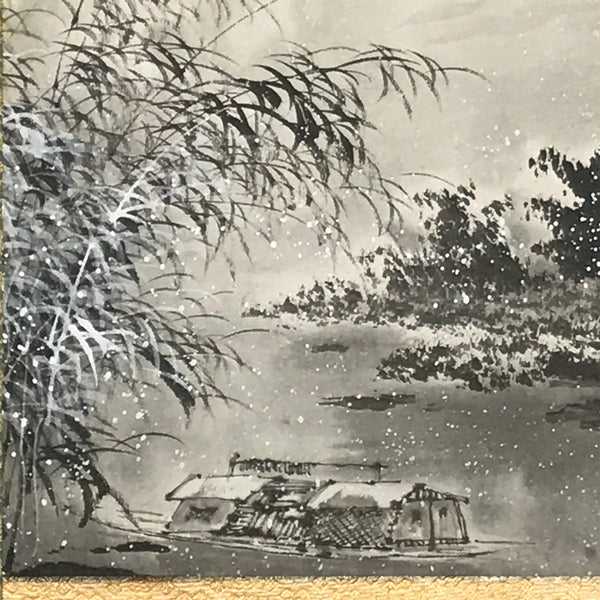This vintage chinese hanging scroll (kakejiku or makimono) features a winter scenery with a boat on a river under falling snow. There are plants in the foreground and mountains in the background.